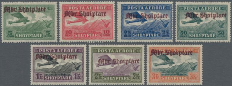 Albania 1929. Kingdom. Complete airmail set (7 values) overprinted in redbrown "Mbr. Shqiptare". Unused. 10 Q with short tooth, 50 Q to 3 Fr. signed. Condition: * (mint hinged) Catalog number(s): 210-216 (Image)