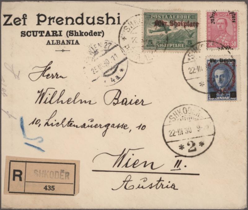 Albania 1929, Airmail Surcharge 5q. green (faults at top) in combination with 50q. lilac-rose and 5q. on 25q. blue on registered cover (opened at two sides) from "SHKODER 22.III.30" to Vienna with transit marks "BARI 23.3.30" + "UDINE 24.3.30" on reverse and arrival mark 25.3. alongside. Rarely seen franking, only 7794 copies of 5q. were surcharged! Condition: Cover Catalog number(s): 210, 194, 200 (Image)
