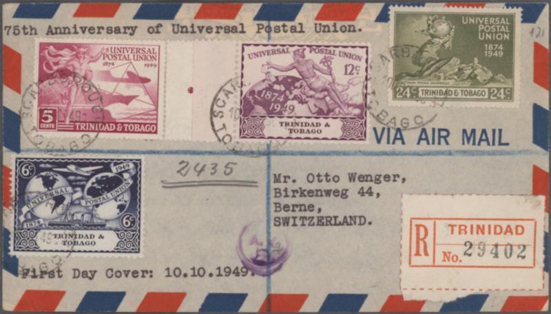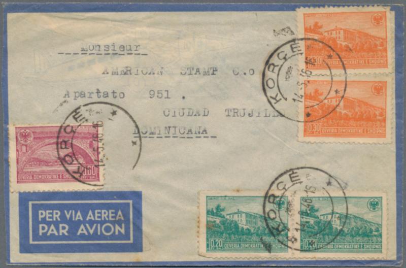 Albania 1945, Definitives "WWII incidents", 0.20fr. blue-green (4), 0.30fr. orange (2) and 0.60fr. purple on front/on reverse (originally attached selvedges have been removed afterwards, apparently) on airmail cover from "KORCE 14.6.46" to Ciudad Trujillo/Dominican Republic with arrival mark 6.7. on reverse, slight faults but very rare commercial cover to most uncommon destination! Condition: Cover Catalog number(s): 379 (4), 380 (2), 382 (Image)
