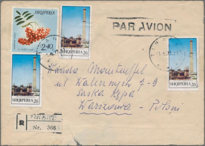 Albania 1970, Industrial Plants 20q. "Phosphate Plant Laç", three values (one stamp corner fault) in combination with 2.40lek. "Fruits" commercially used on registered cover from "TIRANE 1.5.73" to Warsaw with arrival marks 9.5./10.5. on reverse, envelope some postal wear/tears. Condition: Cover Catalog number(s): C 1460 (3), 1541 (Image)