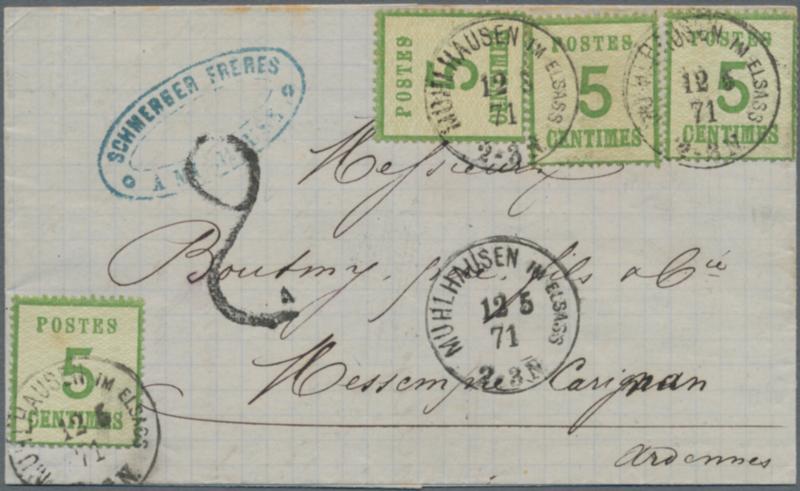 Elsass-Lothringen - Marken und Briefe 1871, 5 C. grün, zwei Briefe mit Mehrfachfrankaturen: vier Werte auf Brief von "MÜHLHAUSEN IM ELSASS 12.5.71" nach Carignan mit rs. Transit- und Ankunftsstempeln sowie französischer Taxe "2"; senkrechter 3er-Streifen in dunkler Nuance auf Brief von "MÜHLHAUSEN IM ELSASS 14.8.71" nach Kierspe/Preußen mit rs. Ausgabestempel. Erhaltung: Brief Katalog-Nummer(n) : 4I (7) (Image)