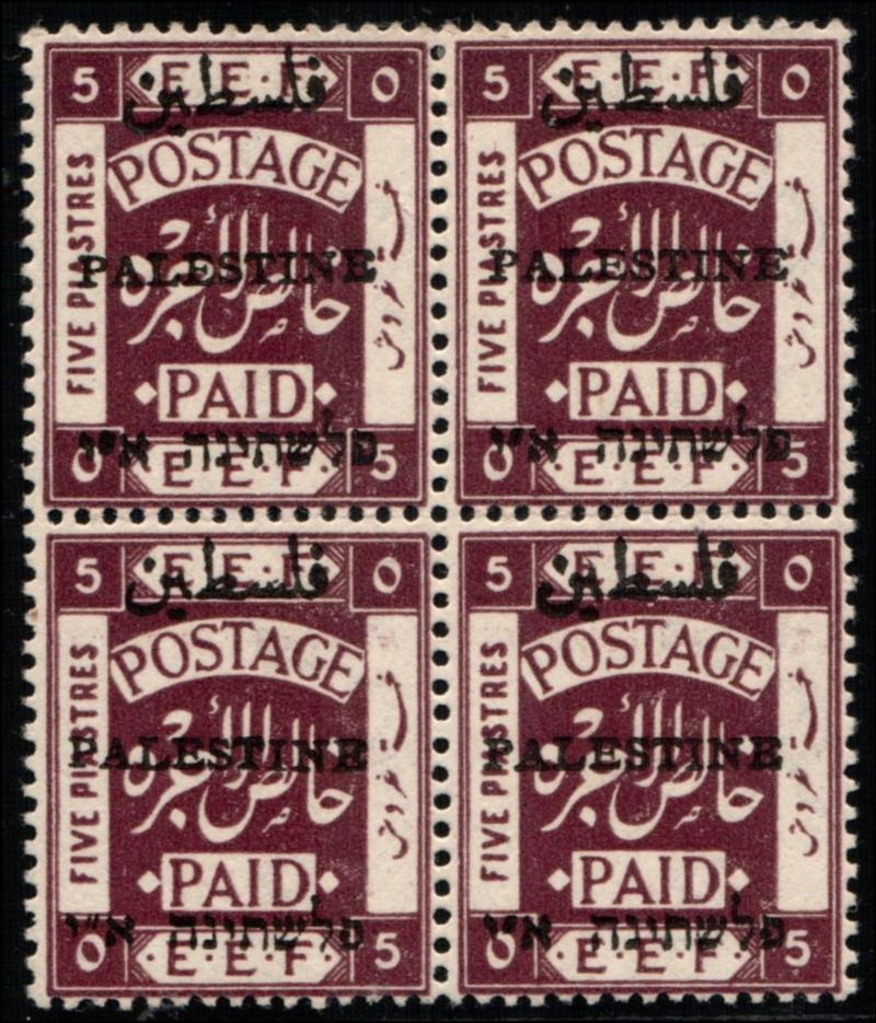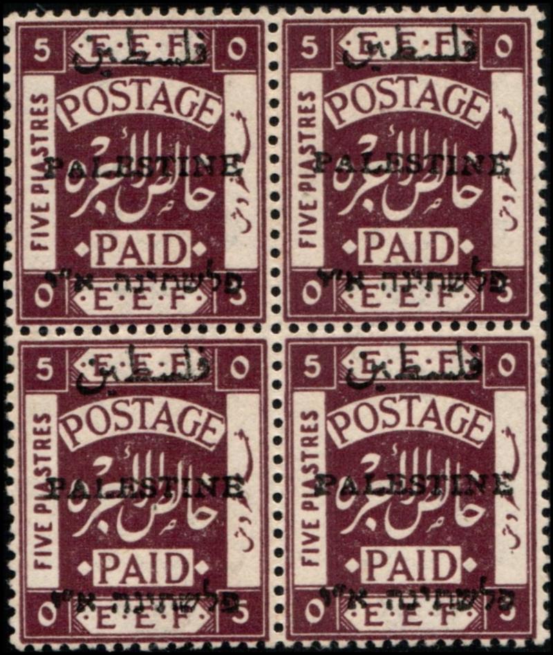 1920 Palestine "Jerusalem I" Block of 4 Bale: 23a 5p purple, original gum MNH. Cat $150.(Image 1) (Image)