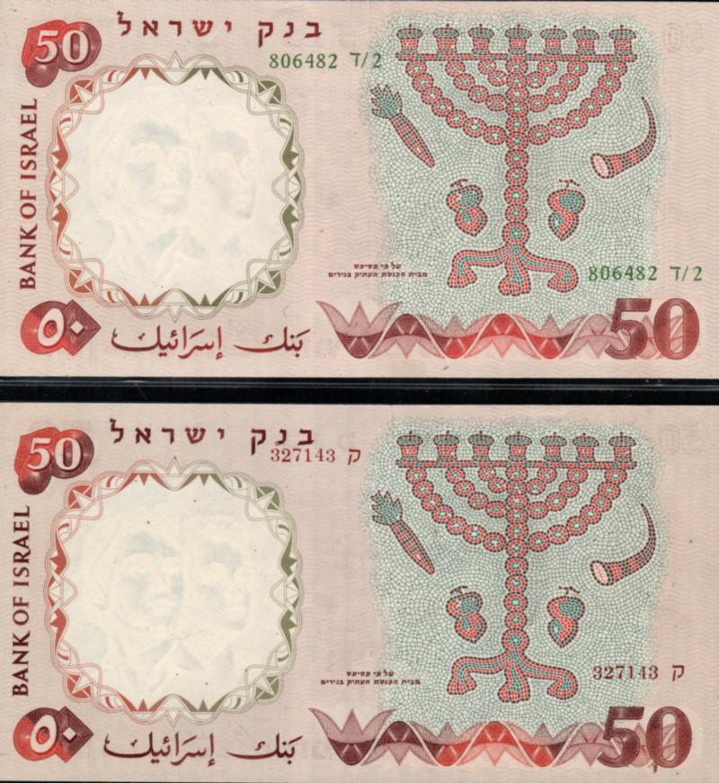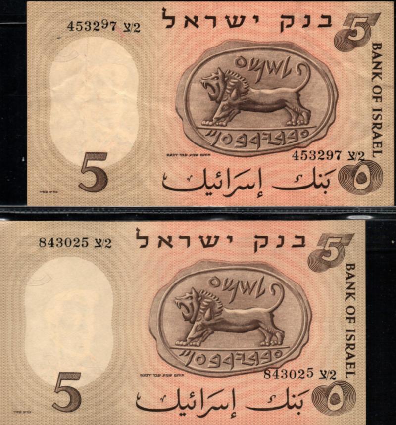 Israel. Bank of Israel 1958 a set of two banknotes, catalog P-31 5 lirot with a misprint in the serial number. One number is moved up.Upper left side 453297 צ/2lower right side 843025 צ/2. AU-UNC (Image)