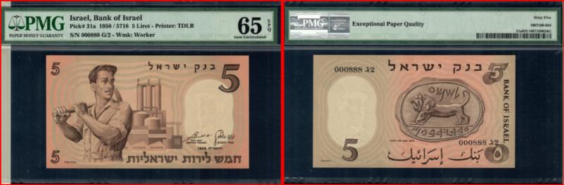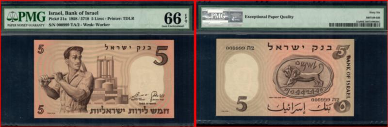 Israel, Bank Of Israel 1958 / 5718 5 Lirot. P-31a S/N 000999 TA/2. PMG-66EPQ. (Image)