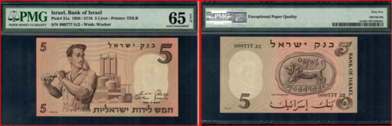 Israel, Bank Of Israel 1958 / 5718 5 Lirot. P-31a S/N 000777 G/2. PMG-65EPQ. (Image)