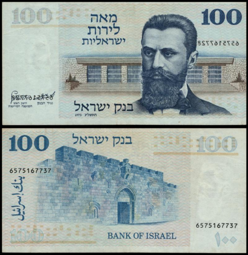 Mega rare! 100 Israeli Lira banknote – Herzl, the series of the gates – 1973, printing error on the front numbers – “mirror printing” banknote number 6575167737. printed on both sides. (Image)