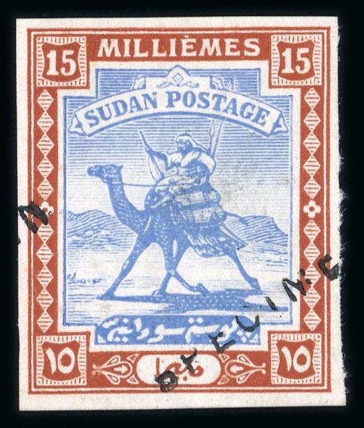 1921-23 1m to 15m set of seven imperforate colour trials in issued colours on watermarked paper, the 4m with camels white neck flaw, each handstamped "SPECIMEN" (DS2), mostly gummed, a fine and very rare set. (Image)