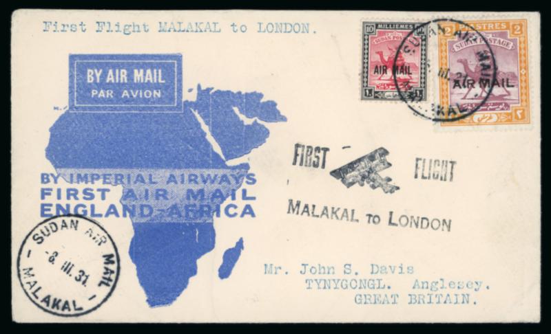 1931 First Flight Malakal to London, franked Airmail 10m & 2pi tied MALAKA/8.III.31 cds, showing First Flight cachet alongside, very fine (Image)