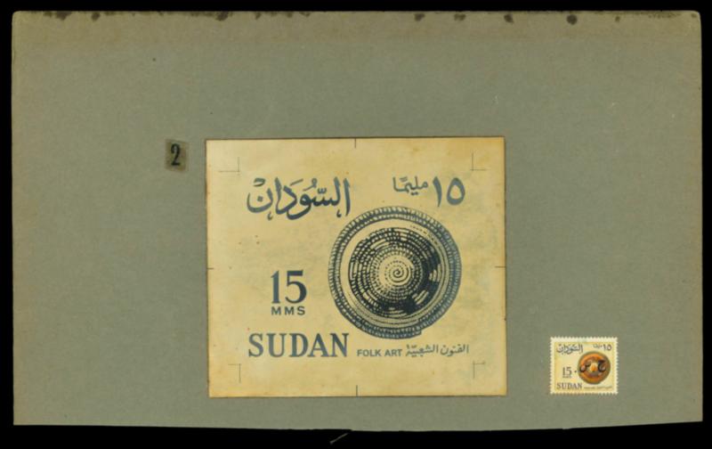 1962 6p cattle, 15m folk art straw cover, two original artworks for issued stamps made by V.G. Pradhan who worked at De La Rue, London. These artworks were developed in the preparation process for the Sudan stamps, and beside it are issued stamps of value 15m (x2), 6p, 55m with light blue SPECIMEN overprint. Unique production elements for the Sudan stamp. (Image)