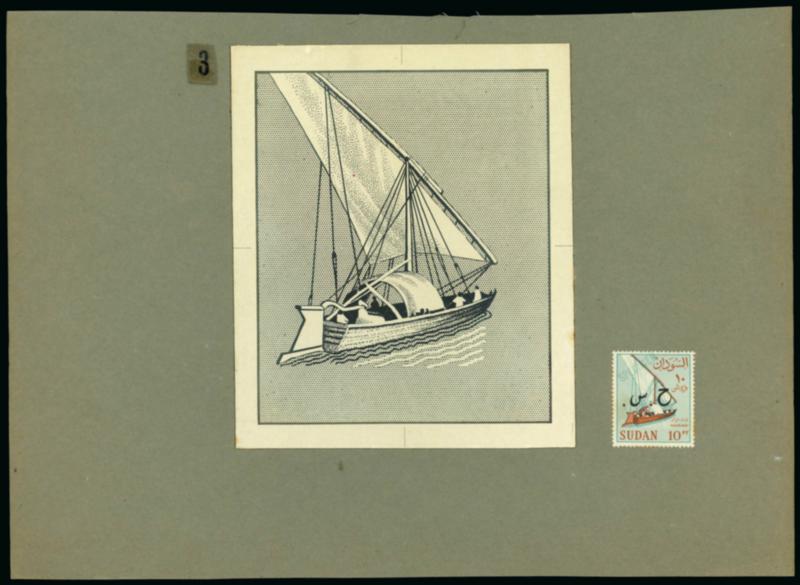 1962 10p sailboat, original artwork for the stamp made by Mr Pradhan who worked at De La Rue, London. This artwork was developed in the preparation process for the Sudan stamp, and beside it is the issued stamps with blue SPECIMEN overprint. Unique production element for the Sudan stamp. (Image)