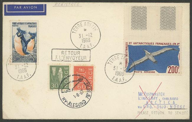 FROM SOUTH POLE TO NORTH POLE: Cover with very nice postage that includes Sc.C3 (1959 200F. albatross) sent on 31/DE/1966 from Terre Adelaide to a Norwegian base in the Arctic, and returned to sender on 1/AU/1967 with Norwegian postage of 90ö., very interesting! (Image)