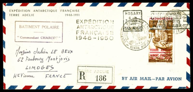 N°1, PA n°1 obl Terre Adelie (20.1.50) sur env. recommandée avec au verso transit et Sydney avec cachet rect « Batiment polaire commandant Charcot » frappé en violet au lieu de rouge + transit Hobart frappé au recto. TB (certificat) Qualité: Oblitéré (Image)