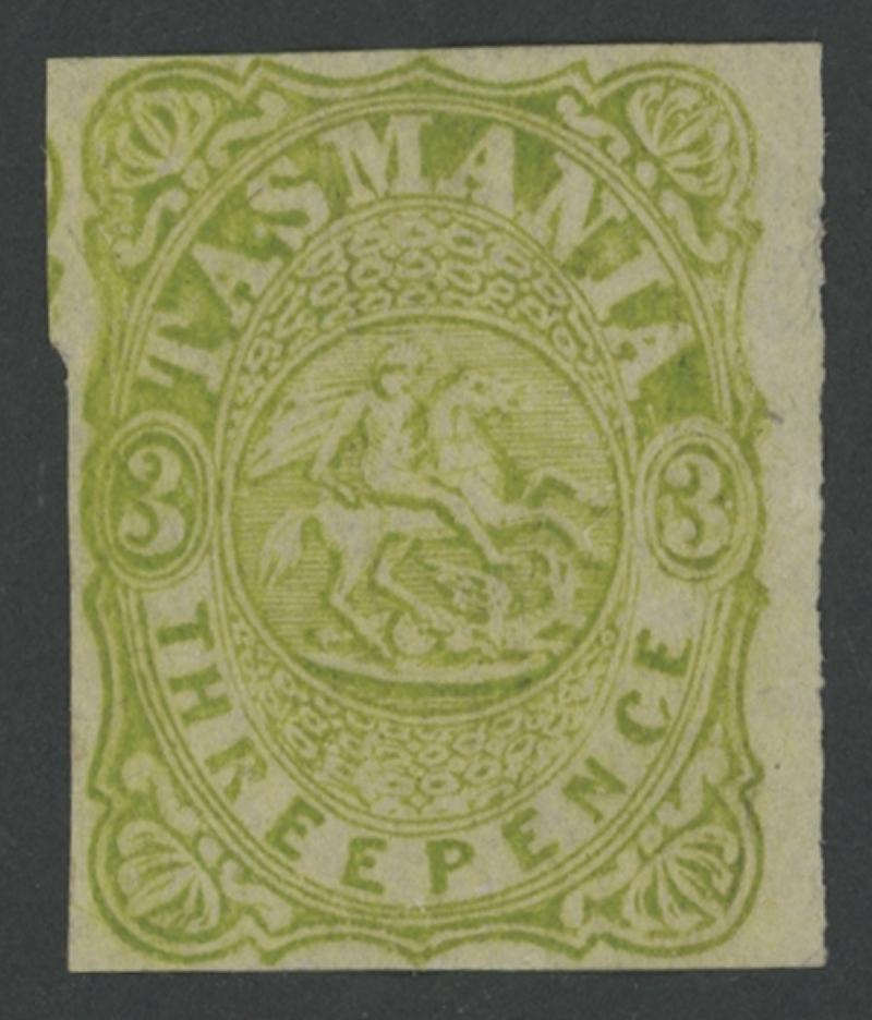 1863-80 St George & the Dragon Imperforate 3d green SG F1 (Scott PF1), margins close to large with a fragment of the adjoining unit at left, unused, Cat £800 (US$800). (Image1)