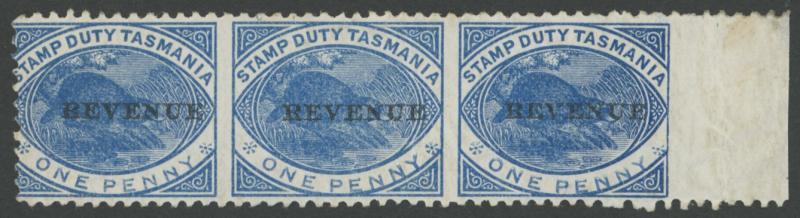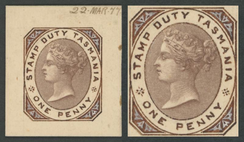 1877 handpainted stamp-size artwork for an unadopted QV design inscribed 'STAMP DUTY TASMANIA/[queen]/ONE PENNY' in purple-brown & China white on thin card (28x31½mm) endorsed "22MAR77" at upper-right. Beautiful, superb and unique. Ex De La Rue Archives - illustrated by Frank Walton at page 6291 - and Francis & Charles Kiddle. The design was abandoned only three days later when De La Rue was advised that the new stamps should feature a platypus. It appears that the frame and border were added to a die proof of the Queen's head. (Image1)