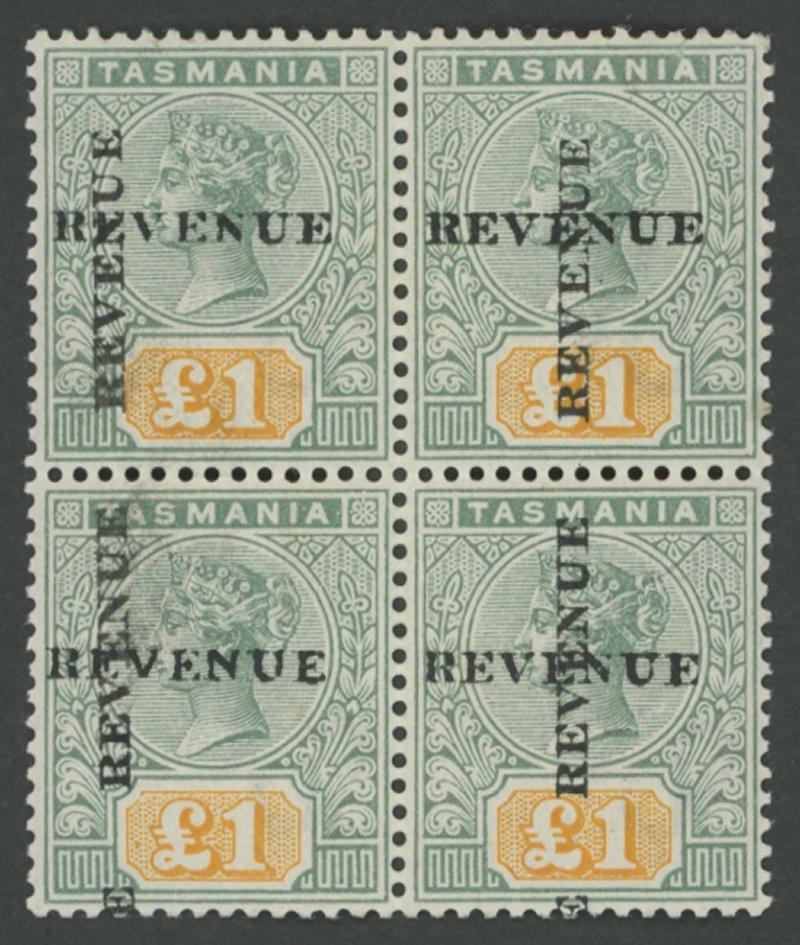 1907 (Jan 5) usage of 'INLAND PARCEL POST/Weight [...] lbs./Number [...]/TASMANIA' black/white label with very scarce franking of Pictorials 1d red & 2d violet and QV Tablets 6d violet & black strip of 3 all punctured 'T' tied by 'ZEEHAN/TASMANIA' cds cancels, tiny corner fault & light fold not affecting the adhesives of markings. The intra-Colonial parcel rate was 9d for the first 2lbs and 3d per additional 1lb; this paid for a parcel weighing up to 6lbs. Ex Dr Owen Ingles. (Image1)