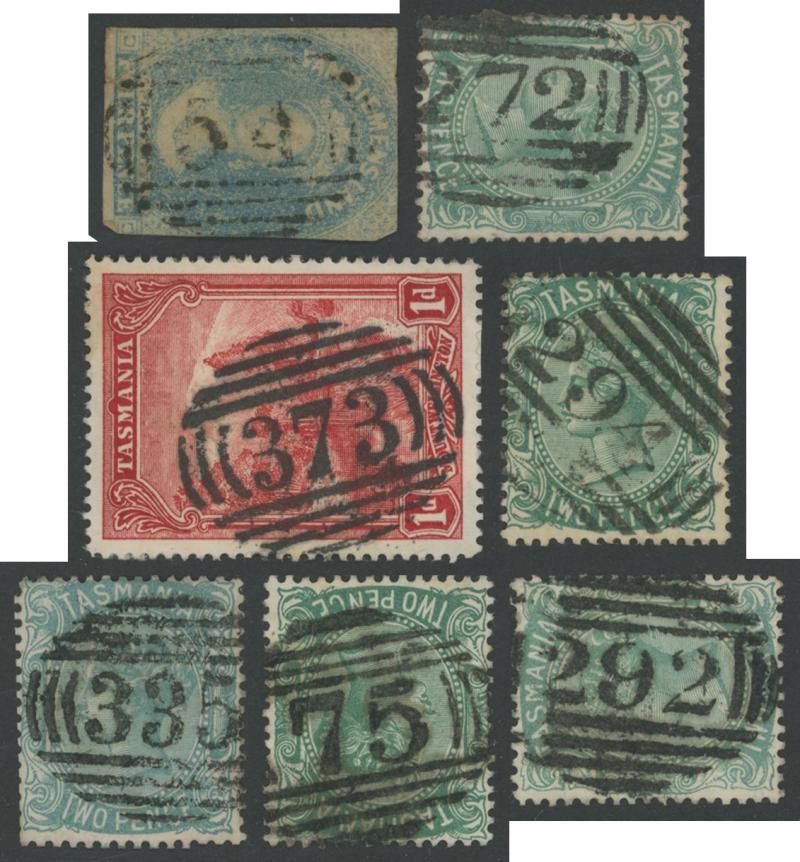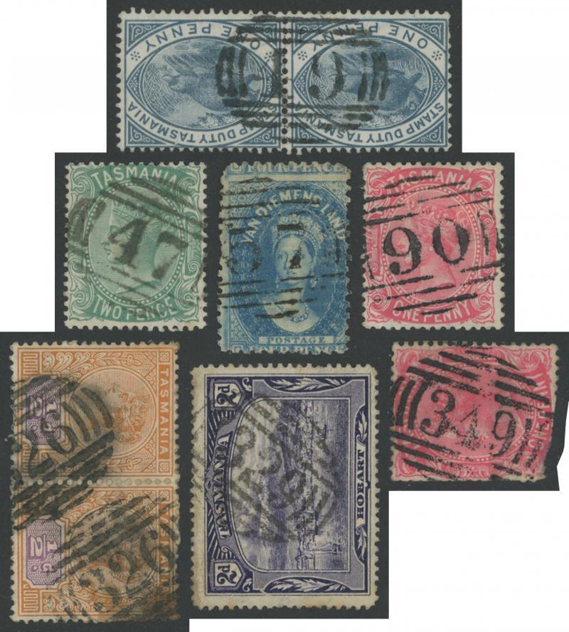 Barred Numerals collection on Hagners from '2' to '374' of Hillend (R) including RRR-rated '57' of Macquarie River on 4d Chalon, '90' of Tinder Box Bay/Pearson's Point on 1d Sideface, '248' of Jetsonville on 1d Sideface, '326' of Mills Reef/Daniel's Bay two strikes on ½d Tablet pair, '349' of Tyena on 1d Sideface (corner fault), RR-rated '44' of Longley, '117' of Old Beach, '120' of Northdown, '211' of Castle Forbes Bay, '223' of Mangalore on 1d Pictorial, '228' of Premaydena, '229' of Taranna, '240' of Berriedale, '252' of Pyengana, '254' of Whitefoord Hills, '256' of Kindred, '283' of Andover, '302' of Snake Plains, '309' of Tunnel, '316' of Apsley, '318' of Lymington x2, R-rated '49' of Kelly's Point on Postal Fiscal 1d Platypus pair, '69' of Port Arthur on 4d Chalon (trimmed perfs), '222' of Stowport on 1d Pictorial, '329' of Chudleigh Junction on 2d Pictorial and many more on Sidefaces, etc, the quality of the strikes generally above-average, condition mostly fine to very fine. A good basis for expansion.