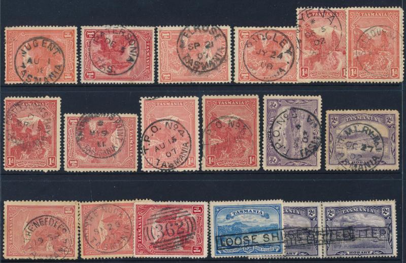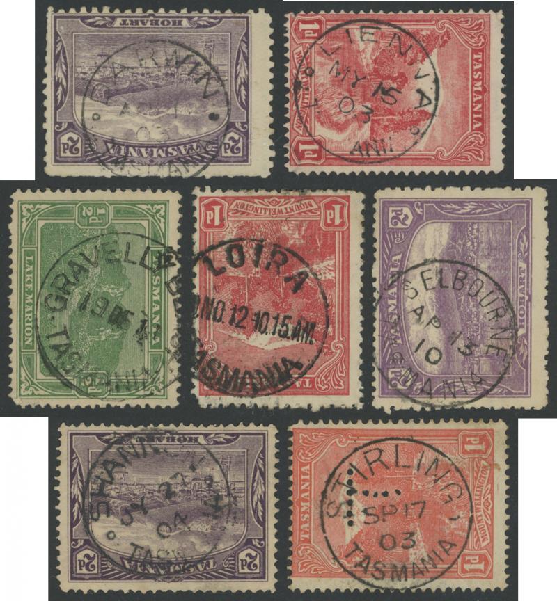 Datestamps on Pictorials collection on Hagners from 'ABBOTSHAM' to 'ZEEHAN EAST' (on 3d brown) with strength in RR-rated items including 'BLACK BRUSH', 'BLESSINGTON UPPER', 'BREAM CREEK' Type 2b, 'BRIDGENORTH', 'CLARENCE PLAINS', 'DARWIN', 'FARRELL SI[DING]', 'GRAVELLY BEACH' Type 2b 1911 on ½d, 'KING RIVER' 1901, 'LIENNA', 'LOIRA', 'LOWER TURNER'S MARSH', 'MOINA', 'MONTEZUMA', 'NATONE' , 'NUGENT' Type 2, 'PALOONA', 'PILLINGER', 'PIPER'S BROOK', 'QUAMBY BROOK', 'RISDON', 'ROSEBERY STATION', 'SELBOURNE', 'SHANNON', 'STIRLING', 'TEMMA', 'UPPER HUON', 'WOODLANDS', etc, also many very fine R-rated & other offices plus a small group of TPOs, the quality of the strikes generally above-average & many are complete, although the higher-rated items a little mixed with some light or partial strikes, condition mostly fine to very fine. A good basis for expansion.