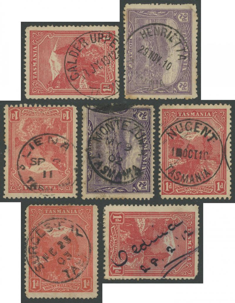 Datestamps on Pictorials collection including RRR-rated 'CAMP CREEK', 'LIENA' (corrected), '[MO]UNT HICKS LWR' & 'SURGES BAY' Type 1a, RR-rated 'BLACK BRUSH', 'BREAM CREEK' Type 2b, 'CALDER UPPER', '[CO]OMBEND', 'GOLDEN VALLEY', 'GRAY', 'HENRIETTA', 'HILLEND', 'LADY'S BAY', 'LIENNA' (misspelled), 'LOWER TURNER'S MARSH', 'MARIA ISLAND', 'MONTEZUMA', 'MOOREVILLE ROAD', 'NATONE', 'NUGENT' Type 2 (superb), 'OYSTER COVE' Type 2a, 'PALOONA', 'RISDON', 'ROSE-VALE', 'ROSEBERY STATION', 'SELBOURNE', 'SHANNON', 'SOUTH PRESTON', 'STIRLING', 'STONEHENGE', 'SURGES BAY' Type 2a, 'THIRLSTANE' Type 1, 'UNDERWOOD', 'UPPER HUON', 'WATTLE HILL', 'WHITEMORE', 'WILMOT LOWER', 'WOODLANDS', etc, and many very fine R-rated offices, higher values noted 'FLOWERDALE', '[FLO]WERDALE UPPER' & 'THIRLSTANE' each on 3d, 'CAPE BARREN ISLAND' & 'GOULDS COUNTRY' each on 4d, 'HAMILTON' on 5d, and 'GA[RDEN IS]LAND CREEK', 'GLADSTONE', 'SORELL' & 'TARANNA' each on 6d, also ERD & LRD section, 'abnormals' including Manuscript "Oldina" on 1d and "Myalla" & "Spreyton" on 2d, and a range of datestamps on other issues, the strikes a little variable but many are fine to very fine. Ex Max Melville.