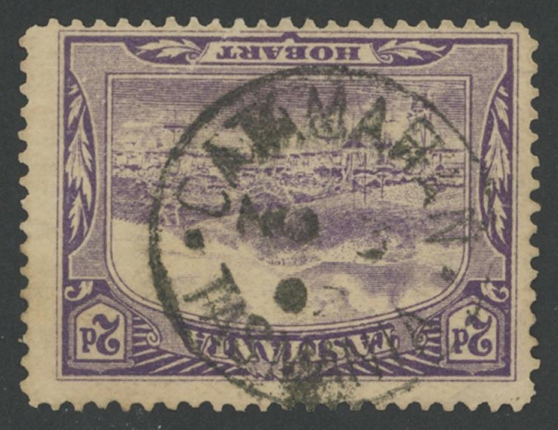 Catamaran (1): 'CATAMARAN/NO 3/02/TASMANIA' cds largely fine strike on Pictorials De La Rue 2d violet. Rated RRRR. PO 1.12.1890; closed 31.12.1902. Ex Max Melville. A slightly better strike - also on 2d violet - sold at our auction of 1.9.2018 for $590 (Sale 229 Lot 552). (Image1)