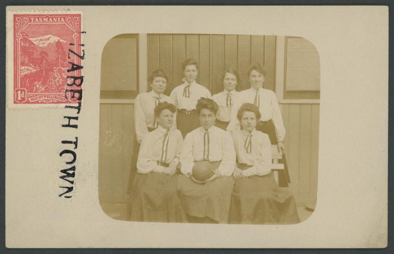 Elizabeth Town: undated straight-line '[E]LIZABETH TOWN' handstamp largely superb strike tying 1d Pictorial to the view-side of circa 1907 real photo PPC of a ladies netball team, to Hobart. Believed to be the only recorded example. Sold at our auction of 19.7.2003 for $710 (Sale 104 Lot 739). The divided back on the card confirms a post-1904 usage. (Image1)