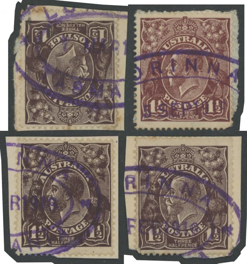 Lorinna: double-oval 'LORINNA/ * TASMANIA * ' in violet, four superb identifiable part-strikes with 1919 dates on KGV 1½d browns. Rated RRRRR. RO 1910; PO 1.7.1927; closed 30.6.1971. Ex John Boykett. (4) (Image1)