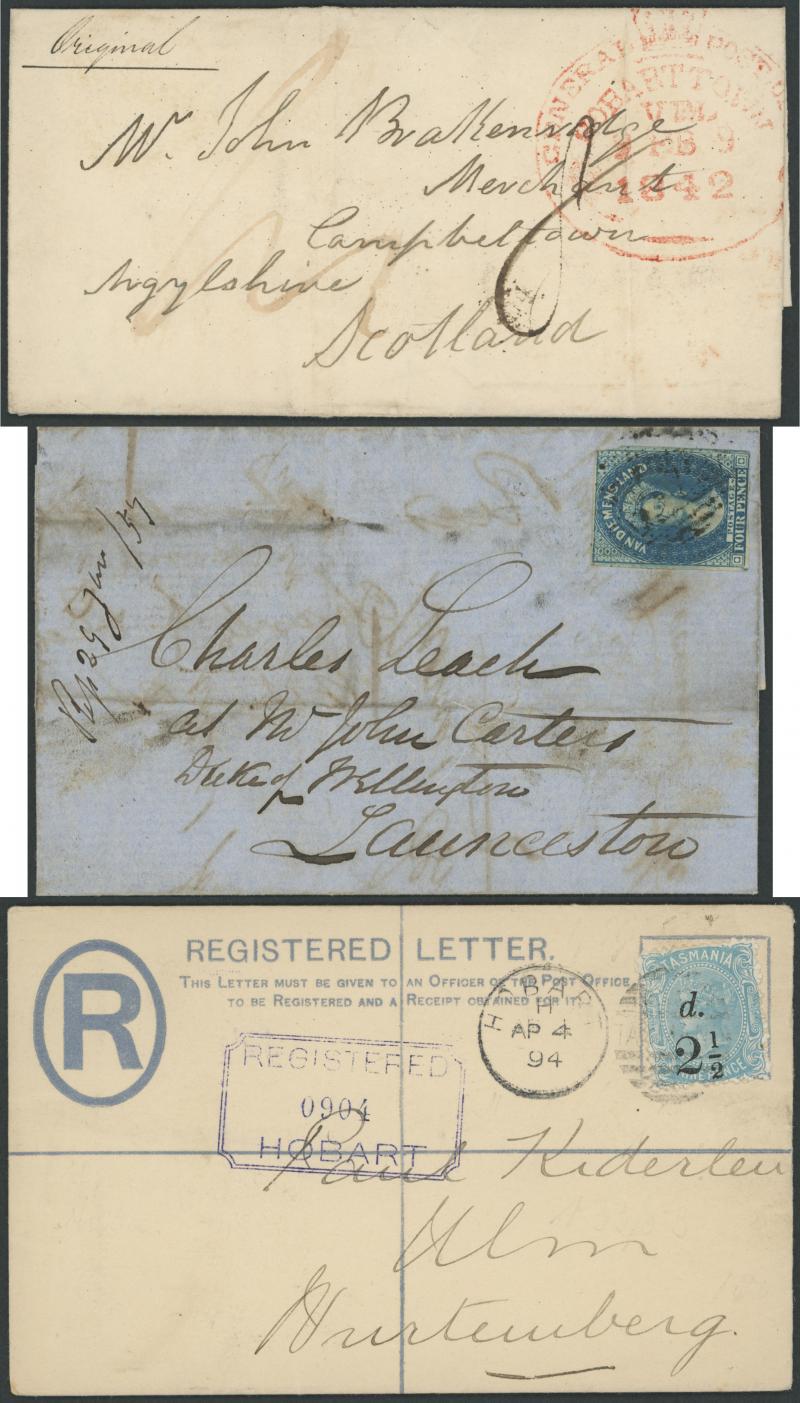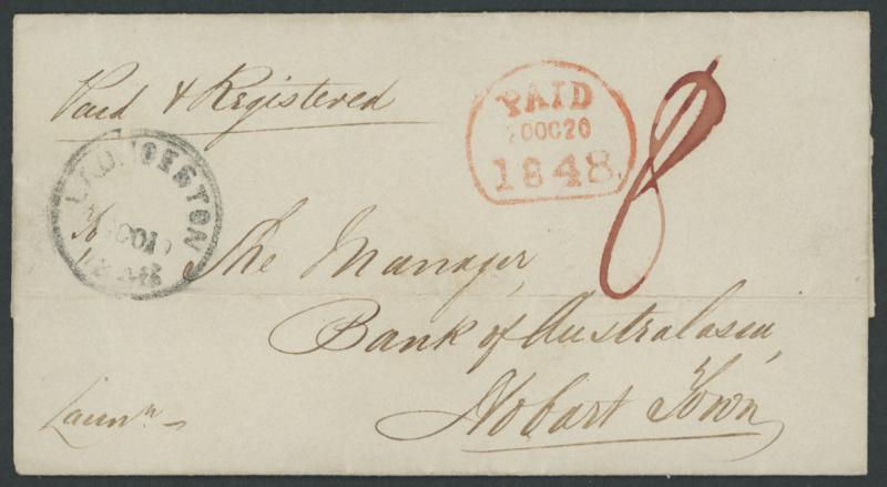 1848 (Oct 19) outer endorsed "Paid & Registered" and virtually-intact 'BANK OF AUSTRALASIA/ LAUNCESTON/1835' wax seal on the reverse, to "The Manager, Bank of Australasia, Hobart Town" with largely fine strike of 'LAUNCESTON/19OC19/1848' double-ring cds in black (Hardinge Type Primitive (iii); rated RR) at left rated "8"[d] paid for 4d letter plus 4d registration fee, largely very fine Hobart 'PAID/20OC20/1848' tombstone datestamp in red (Hardinge Type Paid Dumb (iii); rated R) arrival on the face, light horizontal filing fold almost completely clear of the markings, small closed opening tear on the reverse. Ex Dr Owen Ingles: stated to be the earliest known usage of the word "Registered" on VDL private mail - until 1853, the term was used interchangeably with "Money Letter" - to combat thefts from the mails. (Image1)