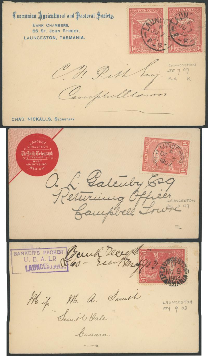 Launceston: undated straight-line '[L]AUNCESTON' largely very strike tying 1d Pictorial to a PPC with briefest message dated "23.10.07". Believed to be the only recorded example. Sold at our auction of 19.7.2003 for $1245 (Sale 104 Lot 743). (Image1)