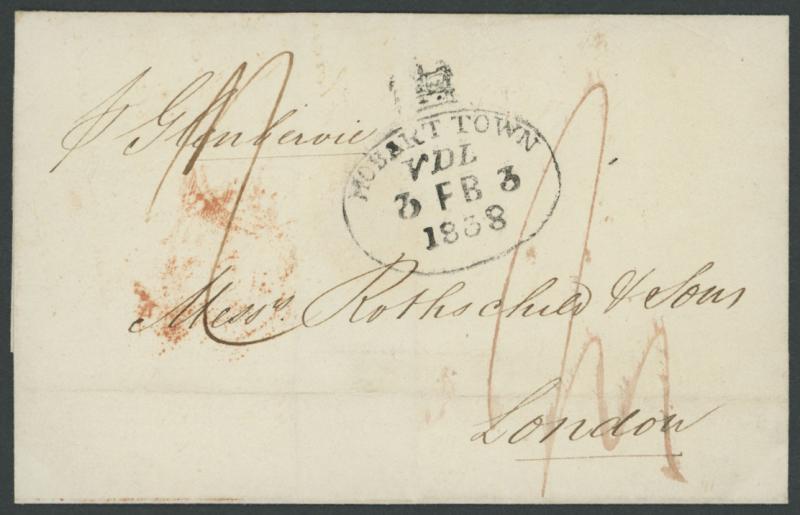 1838 (Feb 3) large-part outer to London endorsed "p Glenbervie" with fine strike of the '[crown]/HOBART TOWN/VDL/3FE3/1838' datestamp (Hardinge Primitive (iii); rated RR), the reverse with boxed 'INDIA LETTER/DOVER' and London arrival backstamp of '21JU21/1838', rated "1/4"[d] for 8d inwards ship letter plus 8d inland carriage, light horizontal filing fold clear of the postmark. Ex John Barwis: sold at our auction of 7.4.2019 for $178 (Sale 234 Lot 970). (Image1)