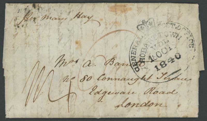 1840 (Oct 16) entire letter to London endorsed "per Mary Hay" with fine strike of the huge oval 'GENERAL [crown] POST OFFICE/HOBART TOWN/VDL/16OC16/1840' datestamp (Hardinge Primitive (iv); rated RR) in black, the reverse with British straight-line 'SHIP LETTER' handstamp and London arrival cds of '12MR12/1841' in red, a few blemishes & small part back flap missing not affecting the markings. Ex John Barwis: sold at our auction of 7.4.2019 for $448 (Sale 234 Lot 971). Although recorded in use 1840-46, this datestamp is known in black during 1840 only. From 1841 it was struck exclusively in red. (Image1)