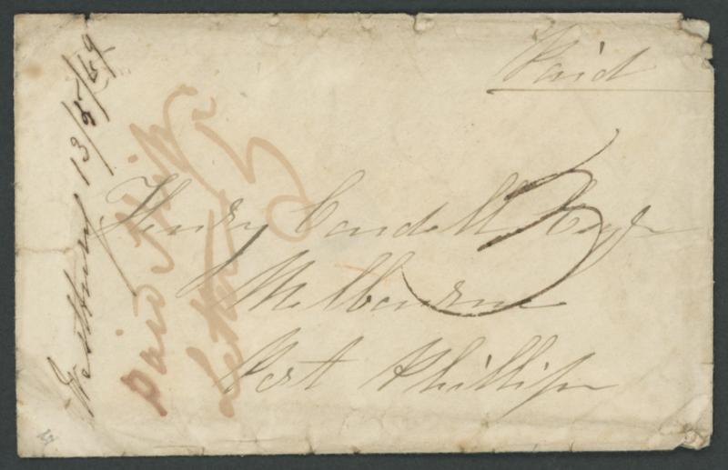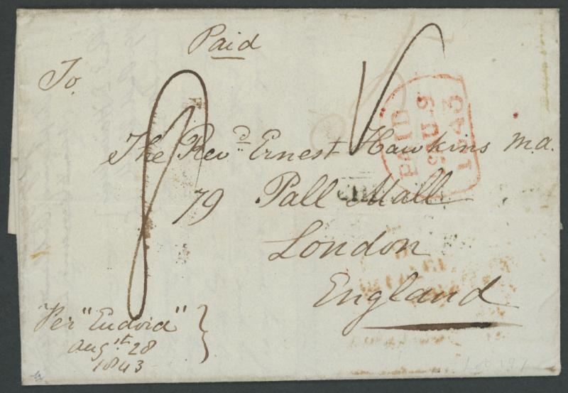 1843 (Aug 19) part-entire letter to London "Per Eudoria/Augst 28/1843" rated "5" (faint) with fine strike of the half-circle 'PAID/29AU29/1843' datestamp unusually in red, British straightline 'SHIPLETTER' handstamp across the flap, rated "8" for an incoming shipletter & with London arrival backstamp of '13JA13/1844' in red, light central filing fold and minor blemishes. Ex Colonel Harrie Evans: sold at our auction of 4.5.2002 for $560. Malcolm Groom recorded the 'PAID datestamp in black to 4DE4/1840 and only one example in red, of 25NO25/1845. The part-letter signed "Gregory Bateman/Chaplain of Oatlands & Jericho" states "...box of seeds...the Porter...can bring it away without its being opened by the Customs House Officers..." (little has changed in almost 200 years). Rev Gregory Bateman was something of an activist and opponent of the death penalty. Colonial chaplains were obliged to tend to condemned men and, after one execution, Bateman publicly washed his hands at the gallows and declared he was "innocent of the man's blood". He was dismissed for crossing the line between Church and State relations. (Image1)
