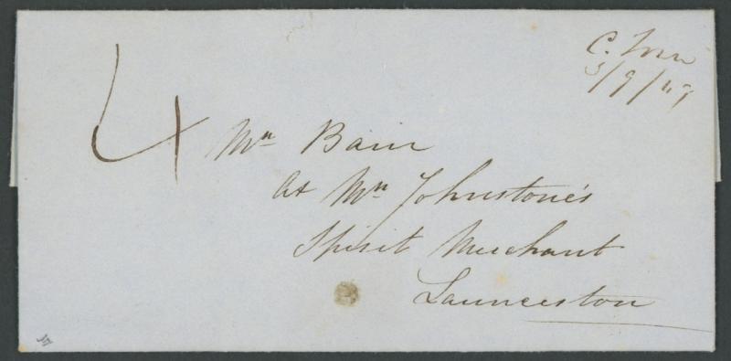 1843 entire letter headed "Lincoln 1st Sept 1849" and signed "E Sherwood" with postmaster's endorsement "C. Town/3 9 49", to "Wm Johnstone/Spirit Merchant/Launceston" and rated "4", very fine 'LAUNCESTON/ 4SE4/1849' arrival backstamp, small filled spikehole otherwise superb. An online 'nub' states Lincoln is a hamlet at the junction of the Macquarie and Isis Rivers. The writer notes he has fallen behind financially "...owing to the dulness of Business" and heavy flooding. (Image1)
