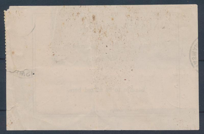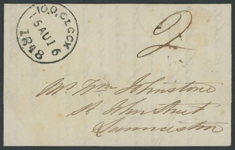 1848 (August 14) entire Bank of Australasia, Launceston printed dishonour notice sent locally unpaid with superb strike of '10.O.CLOCK/15 AU 15/1848' cds in black (Hardinge Type City Post Dumb (i); rated RR) at upper-left, rated "2"[d] in black payable by the recipient, small repaired spike hole on the face. Ex Dr Owen Ingles. Launceston 2d town letter rate (three deliveries per day, at 10am, 1pm & 4pm). (Image1)