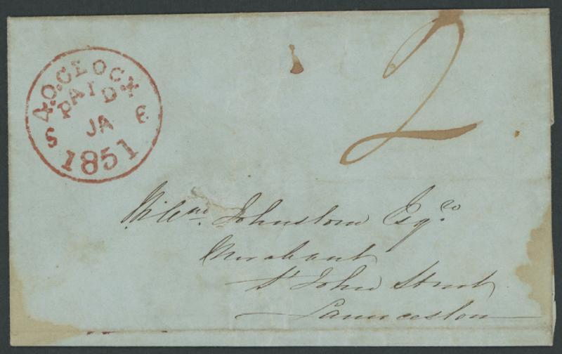 1851 (Jan 6) large-part entire letter sent locally with superb strike of '4.O.CLOCK/PAID/6 JA 6/1851' cds in red (Hardinge Type City Post Dumb (vi); ERD; rated RRR) at upper-left, rated "2"[d] in red paid by the sender, internal paper deterioration & staining that has been trimmed away only slightly affecting the otherwise fine facial appearance. Ex Dr Owen Ingles. Stated to be the earliest recorded example of the 'PAID' datestamp from this time. (Image1)