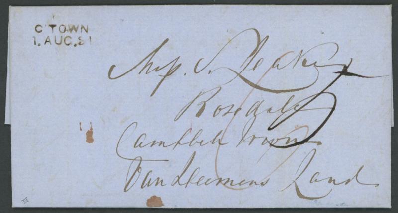 1851 entire letter headed "Adelaide July 19th 1851" and signed "BR Leake" to his sister at "Rosedale/Campbell Town/Van Diemens Land" apparently carried per favor by ship with very fine 'LAUNCESTON/1AU1/1851' transit backstamp and largely superb strike of the postmaster's private 'C'TOWN/1.AUG.51' arrival handstamp on the face, rated "5" in black for an incoming shipletter but overwritten "6" in red for an additional 1d for inland delivery, two light ironed-out vertical folds hardly detract from the very fine appearance. Rare format of the 'C TOWN' marking, this being the latest of only four recorded examples. Sold at our auction of 27.7.2009 for $2680 (Sale 147 Lot 403). John Leake arrived in the Colony in May 1823. He was granted 2000 acres near Campbell Town, which he named Rosedale. Two of his sons took up property at Glenroy SA, near the Victorian border. (Image1)