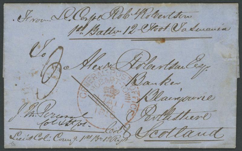 1856 entire soldier's letter headed "Hobart Town Tasmania/8th January 1856" and signed "Robt Robertson/1st Btln 12 Regt", to Scotland endorsed "From LCorpl Robt Robertson/1st Battn 12 Foot Tasmania" and countersigned at lower-left "JM Percival/Lieut Col Comg 1st Bn 12 Regt", fine strike of the 34mm Hobart-Town GPO cds in red, the reverse with London transit cds of '12MY12/1856' in red and boxed 'BLAIRGOWRIE' arrival backstamp in green, remarkably fine. The social letter states "...[we] having arrived from Victoria...my youngest son James...fell down the stairs in the Barracks and broke his leg..." An unexpected insight into a soldier having his family living with him. Sold at our auction of 22.4.2006 for $5360 (Sale 121 Lot 384). (Image1)