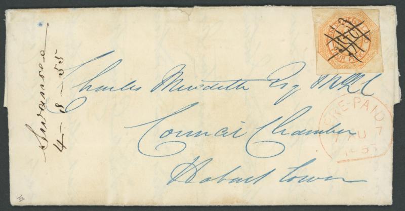 1856 entire letter headed "Swansea 4 Augt 1855" and signed "A Graham" to Hobart with a huge QV Courier 4d orange SG 10 (margins good to very large with a fragment of the adjoining unit at the base but with a couple of concealed faults, Cat £425) lightly pen-cancelled and overwritten with manuscript "58"-in-Cross-Hatching of Waterloo Point Receiving Office, postmaster's endorsement "Swansea/4-8-55" at left, light 'PRE-PAID/7AU7/1855' arrival datestamp in red. A rare cover: very few country Receiving House covers are recorded in this period. Ex John Cress - sold for $3450 - and David McNamee: sold at our auction of 7.5.2013 for $4425 (Sale 180 Lot 340).