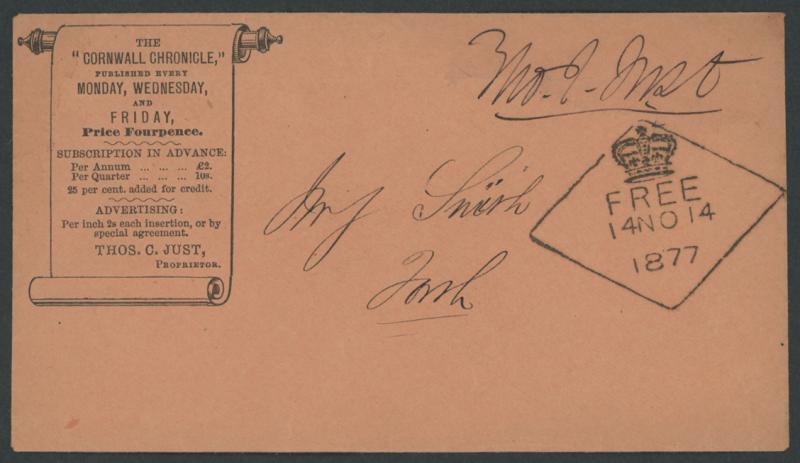 1877 (Nov 14) stampless Cornwall Chronicle black/salmon illustrated advertising envelope with scroll & subscription rates, to Forth with superb strike of Launceston 'FREE' crowned diamond datestamp in black (Hardinge Type Diamond; rated RR) at upper-right, very fine. Ex Dr Owen Ingles. (Image1)