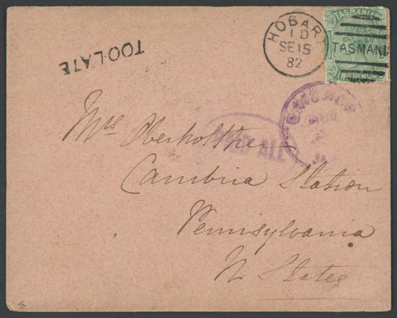 1882 (Sep 15) trans-Pacific envelope to Pennsylvania USA with Sideface 2d only tied by Hobart duplex, very fine strike of the 'TOO-LATE' handstamp, Sydney transit backstamp of SP22/82 where 'PAID ALL'-in-oval handstamp in purple struck on the face, Chicago transits, minor blemishes. Ex Tony Rigo de Righi, Randall Askeland and Patrick Reid: sold at our auction of 17.10.2008 for $436 (Sale 140 Lot 430). Believed to be the only recorded 'PAID ALL' cover from Tasmania, perversely on a cover that is clearly underpaid! (Image1)
