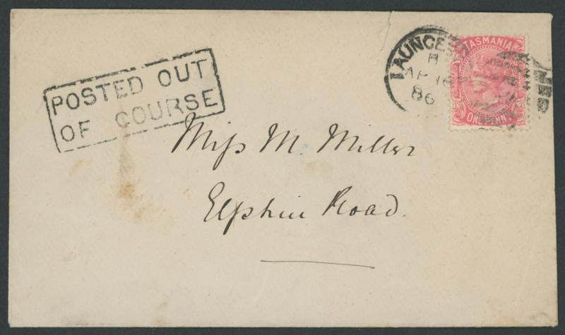 1886 (April 16) local envelope with QV Sidefaces 1d rosine tied by Launceston duplex cancel, very fine complete strike of 'POSTED OUT/OF COURSE' boxed handstamp alongside on the face, small closed tear at upper edge not affecting stamp or markings & a couple of minor blemishes. Ex Dr Owen Ingles. See also Lot 723 below. (Image1)