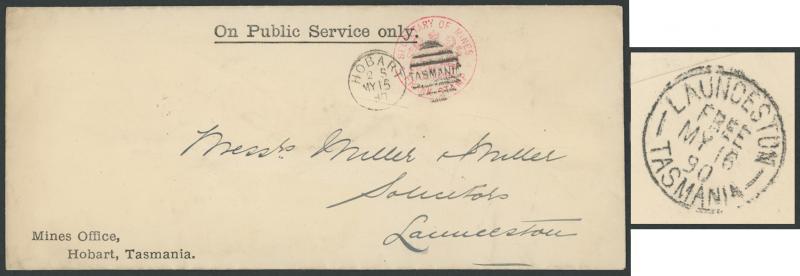 1890 (May 15) Mines Office Hobart 'On Public Service Only' long-format envelope with Coat of Arms on back flap and 'SECRETARY OF MINES' Frank Stamp handstamp in rosine on the face cancelled by Hobart duplex, to Launceston with very fine strike of the scarce 'LAUNCESTON/FREE/MY 16/90/TASMANIA' cds (recorded 3.12.1888 to 12.6.1900 only; apparently unlisted by Hardinge) as an arrival backstamp, a few minor blemishes. Ex Dr Owen Ingles. (Image1)