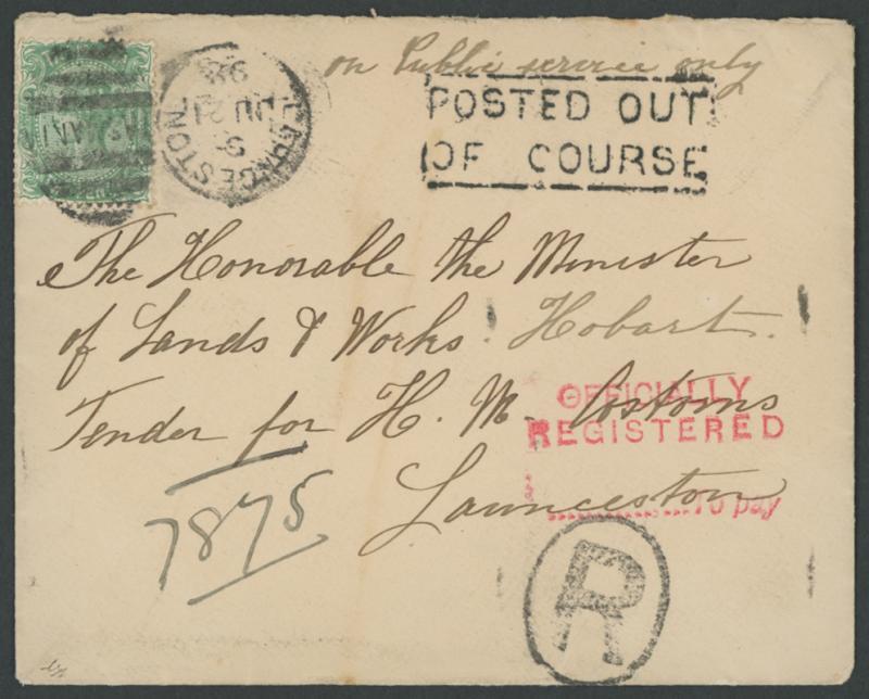 1898 (June 21) envelope to "the Minister of Lands & Works" and endorsed "Tender for HM Customs/Launceston" with Local Sidefaces 2d only tied by Launceston duplex, apparently posted in a letter box which explains the superb strike of the 'POSTED OUT/OF COURSE' handstamp, equally fine strike of the very rare 'OFFICIALLY/ REGISTERED/...To pay' handstamp in rosine but no fine entered because registration was without charge to the sender or recipient. A wonderful cover, bearing the only recorded example of the Launceston Officially Registered handstamp. Ex David McNamee: sold at our auction of 2.5.2014 for $1280 (Sale 191 Lot 2096). (Image1)