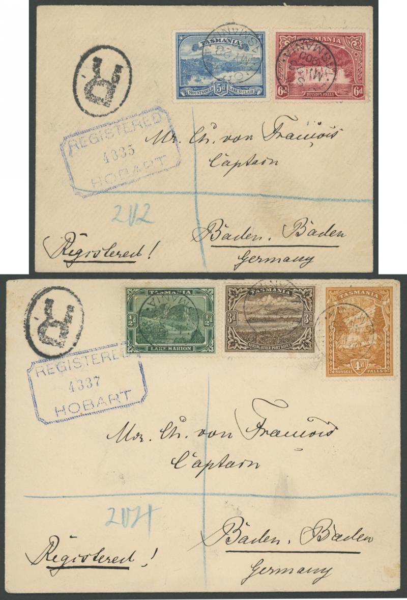 1900 (May 28) two envelopes registered to Germany with Pictorials ½d green, 3d sepia & 4d orange and with 5d blue & 6d lake respectively tied by Hobart 'MY28/1900' cds cancels, each with 'R'-in-oval cachets in black and largely very fine 'REGISTERED/HOBART' chamfered-box handstamps in blue on the face and Baden Baden '3.7.00' arrival backstamps, a few minor transmission marks. Ex Dr Owen Ingles: stated to be the First Day of Issue of the ½d (now known to be 31.3.1900), 3d & 4d values. (Image1)