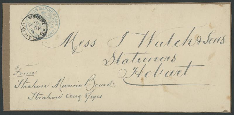 1901 (Aug 5) makeshift entire parcel label endorsed "Strahan Marine Board" at lower left with scarce 'STRAHAN MARINE BOARD' Frank Stamp handstamp in blue at upper-left cancelled by very fine 'STRAHAN' cds, to Hobart affixed to brown parcel piece, a few minor blemishes. Ex Dr Owen Ingles. (Image1)