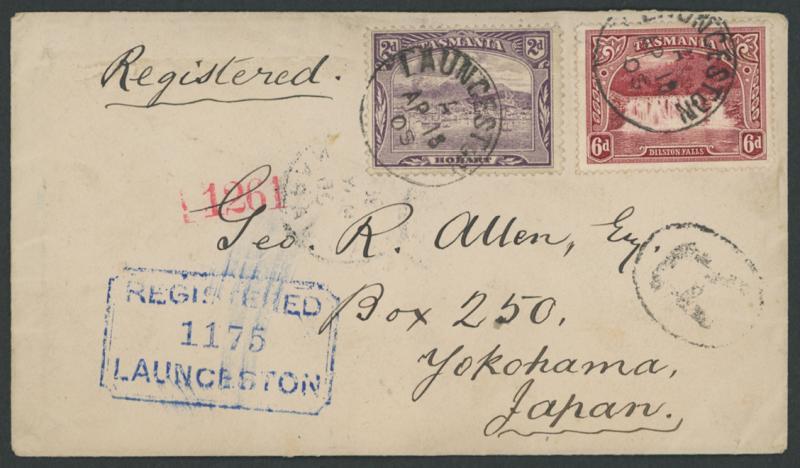 1905 (April 18) envelope registered to Japan with Pictorials 2d violet & 6d lake tied by Launceston cds cancels with 'R'-in-oval cachet in black and largely very fine 'REGISTERED/LAUNCESTON' chamfered-box handstamp in blue on the face, 'REGISTERED/MY20/05/G.P.O. HONG KONG' transit and 'YOKOHAMA/ 30/MAY/05/JAPAN' arrival backstamps, a few minor transmission marks. The rate was 2½d per ½oz UPU foreign letter x2 plus 3d registration fee. Ex Dr Owen Ingles. (Image1)
