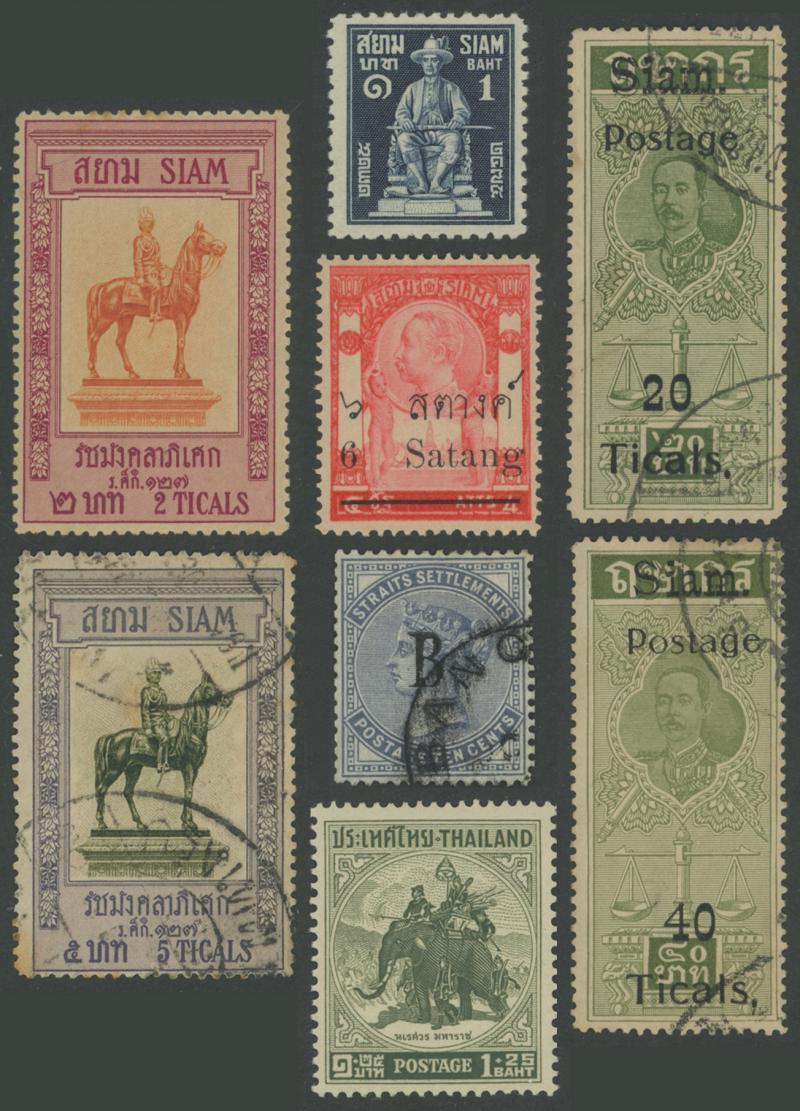 Useful selection mostly in packets as bought from American postal auctions including First Issue mint set, 1887 8a block of 4 with boxed cancel, 1899-1904 Sidefaces used set, 1899-1901 '1' on 2a SG 20 mint x9, 1907 High Denomination Postal Fiscals set used, 1908 Statue mint 2t and used 3t & 5t, 1909 'Satang' Surcharges mint set of 11, 1910 Garuda set **, 1928 Prajadhipok used set plus extra 10b 20b & 40b, 1932 Dynasty mint set, 1939 Constitution mint set x2, 1955 Naresuan mint set, colourful modern issues ** including sheetlets and 1987 King's Birthday 100b, also 'B' Overprint on Straits 10c with bold 'BANG[KOK]' cds, generally fine to very fine.