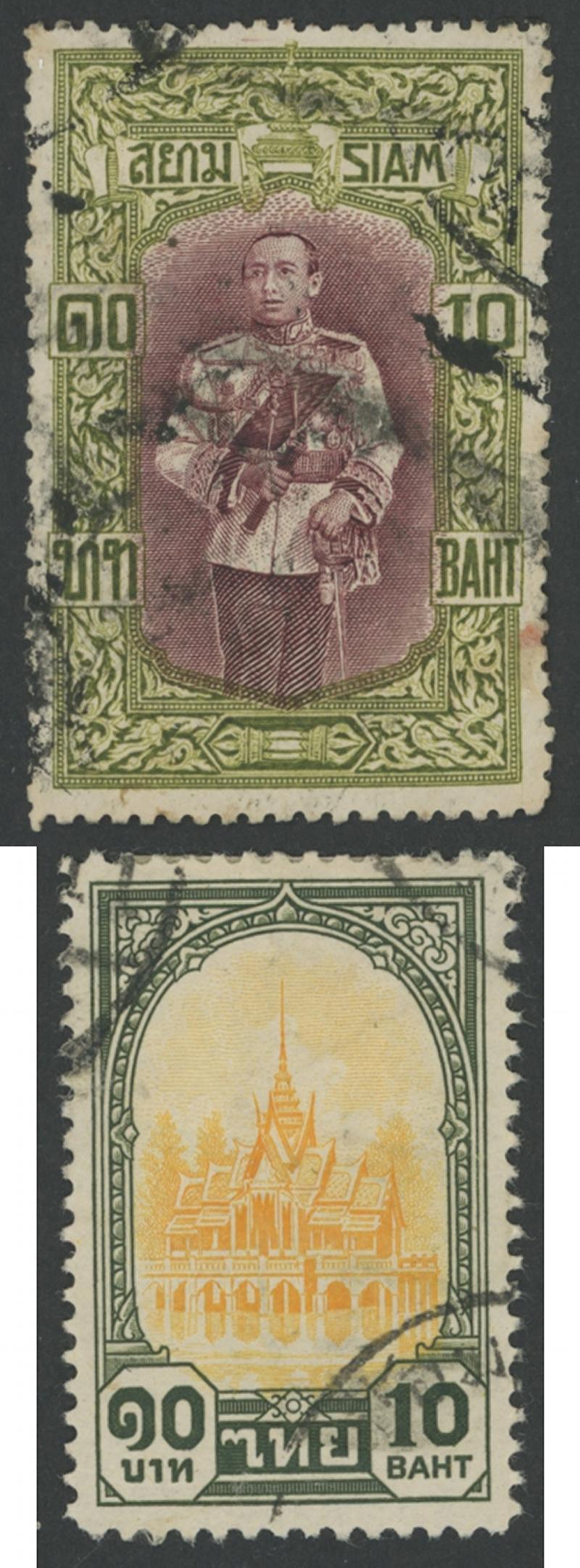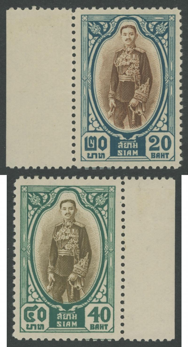 1928 King Prajadhipok 20b & 40b SG 265 & 266 (Scott 221 & 222) marginal singles, both well-centred & very lightly mounted, Cat £345 (US$330). (2) (Image1)