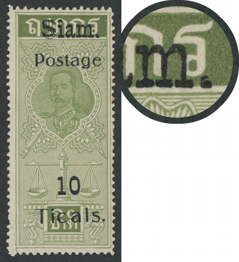 1907 King Chulalongkorn Tall Revenue Stamps Overprinted 'Siam/Postage' '10/Ticals' on 10t olive-green SG 106 (Scott 106) with Broken Stop after 'Siam' (unlisted), tiny hinge remainder, Cat £900+ (US$750+). (Image1)