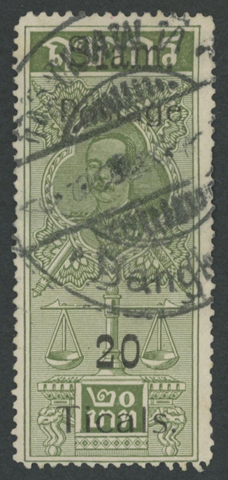 1907 King Chulalongkorn Tall Revenue Stamps Overprinted 'Siam/Postage' '10/Ticals', 20/Ticals' & '40/Ticals' set SG 106-108 (Scott 106-108), all with cds cancels, those on the 20t & 40t doubled & a little heavy as to be expected for stamps used on parcels of letters, the 10t lightly cancelled & very fine, Cat £1200 (US$1050). (3) (Image1)