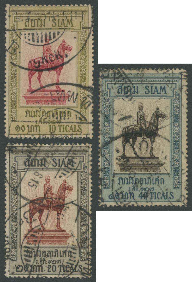 1908 King Chulalongkorn Coronation Commemoration Statue 10t, 20t & 40t SG 122-124 (Scott 122-124), all with light cds cancels, Cat £670 (US$650). (3) (Image1)