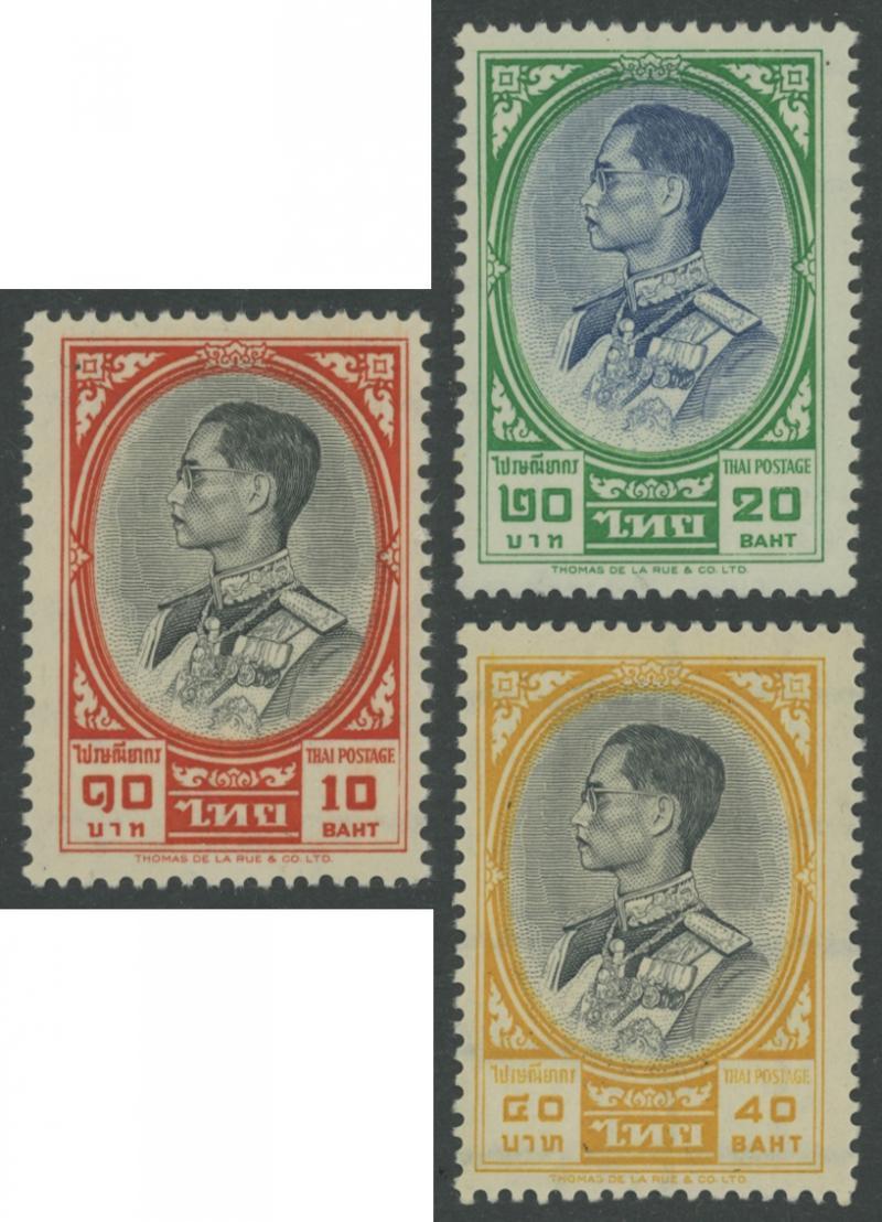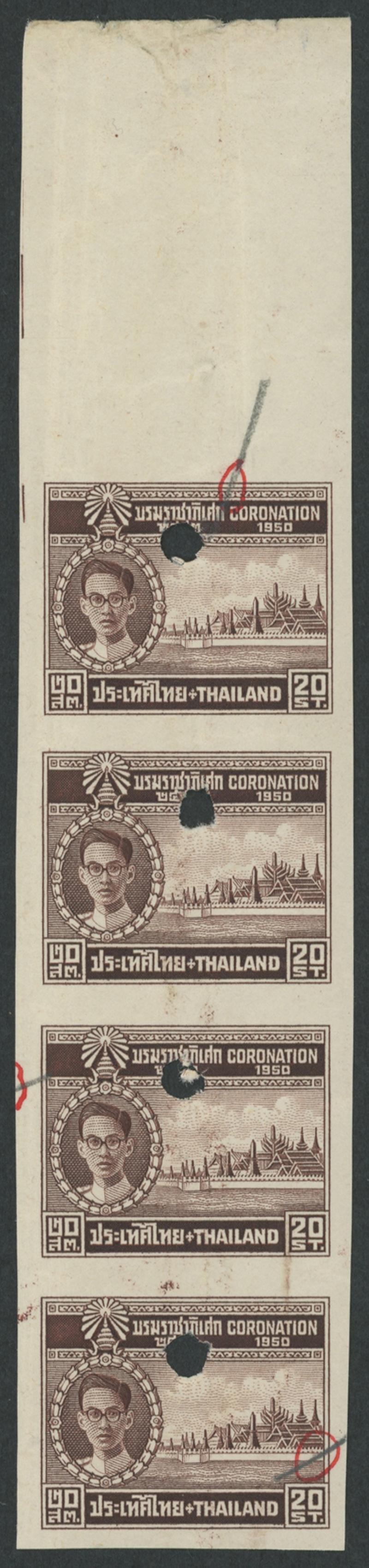1950 King Bhumibol Coronation 5s purple, 10s scarlet & 20s brown Waterlow & Sons imperforate plate proofs in the issued colours on unwatermarked gummed paper marginal vertical strips of 4 from the top of the sheets, the 10s & 20s with correction mark-ups in pen, each unit with security punch, light bends & minor ink transfer on reverse, unmounted.